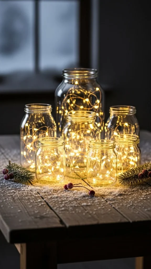 Fill jars with small fairy lights. Cluster two or three together on the table. Add small pinecones or berries around the base. The lights provide warmth and sparkle, even without candles. Jars can be reused year after year. This arrangement works well for evening dinners or cozy winter events.