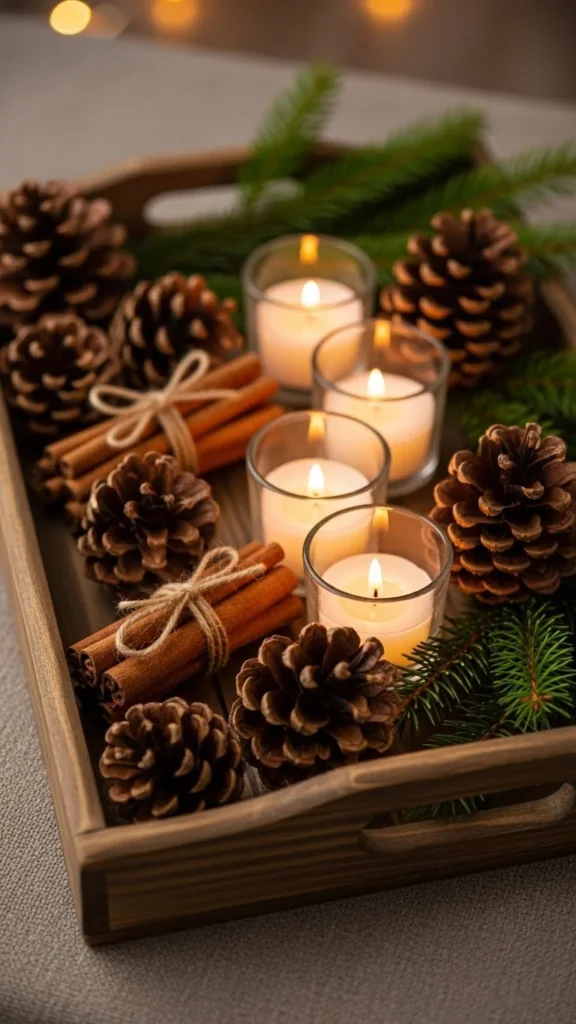 Use a shallow tray to anchor multiple elements. Add candles, pinecones, and greenery loosely arranged. The tray keeps things tidy and portable. You can move it easily if needed. Use natural materials to keep the look seasonal. Add a small ribbon around a candle for soft color. This display works well for casual or formal tables alike.