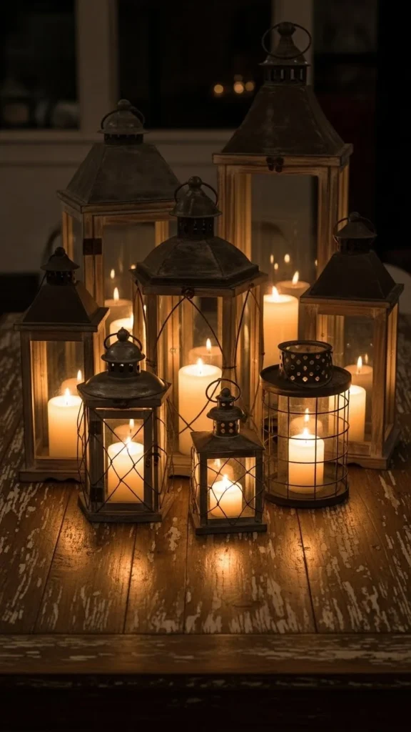 Group two or three lanterns of varying heights. Place flameless candles inside for safety. Scatter small pinecones or greenery around the base. Lanterns bring structure and charm to a winter table. You can find inexpensive lanterns at thrift stores or use ones you already have. Keep the cluster slightly off-center for a casual, inviting vibe.
