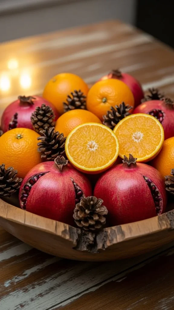 Combine seasonal fruits like oranges, pomegranates, or cranberries with a few natural elements. Use a rustic bowl or plate. The colors feel seasonal and add freshness. This centerpiece is edible and budget-friendly. Swap out fruits as they ripen to maintain the look. Arrange in a loose pile for a casual, natural feel.