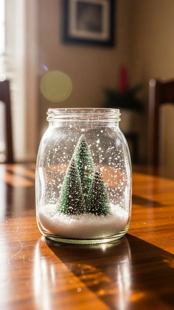 Repurpose glass jars to create snow globes. Place tiny faux trees inside and sprinkle white glitter for snow. Add a small battery candle behind the globe for glow. Snow globes bring whimsical charm and can be made in minutes. Use jars of different sizes to create variation. Display them in clusters for more impact.
