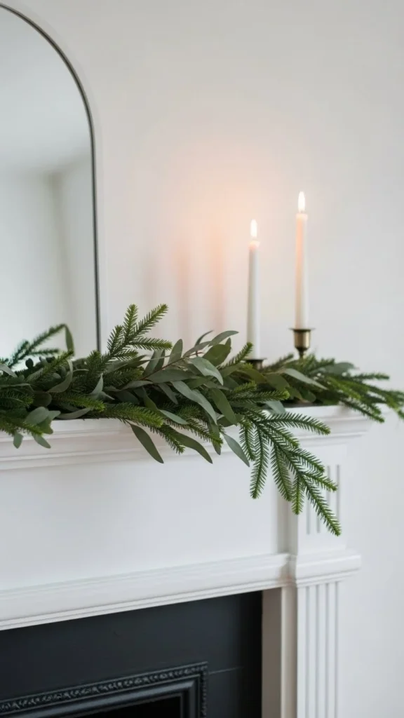 Keep additional decor minimal. A few candles or framed art pieces placed in front of the garland help anchor the look without crowding it. The greenery itself does most of the visual work.
