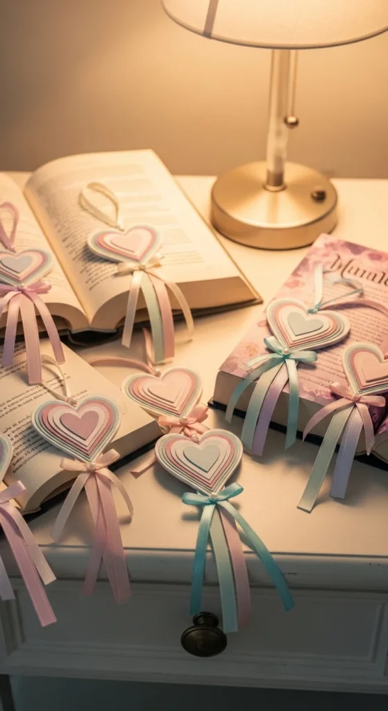 Layered heart bookmarks are sweet and simple, especially if you want something cute for journals, romance novels, or gift books. Cut two or three heart shapes in different sizes, stack them, and glue them near the top of a bookmark strip or onto a corner bookmark base. The layered look adds dimension without making the project hard. Soft pink, red, cream, lavender, or peach colors work beautifully, though a neutral version with beige and white can look lovely too. This idea is inexpensive because small paper scraps are enough to make several hearts. You can use cardstock, scrapbook paper, old cards, or even painted paper from past projects. Add a little ribbon tail, tiny dots, or hand-drawn details if you want something extra. These bookmarks make nice little add-ons for gifts, especially when paired with notebooks or novels. They are also great for Valentine crafts or reading group treats. Since the main shape is so simple, this is a very beginner-friendly project. It feels soft, cheerful, and handmade without taking much time. A tiny layered heart can turn a plain bookmark into something much more charming.