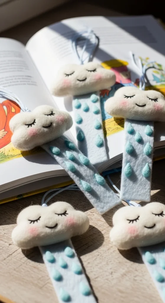 Sleepy cloud bookmarks are adorable and easy to make with just paper, felt, or light cardstock. Cut a cloud shape for the top, then attach it to a strip bookmark or paperclip base. Add closed eyes, little pink cheeks, and maybe tiny raindrops, stars, or a moon for a dreamy look. This style is especially cute for bedtime reading, children’s books, or cozy journal pages. Soft blue, white, gray, and pale pink are perfect colors, but you can make rainbow cloud versions too if you want more color. This project works well because the shapes are simple and forgiving, so you do not need perfect cutting or drawing. It is also easy to make on a budget with scraps from old craft supplies. A little cotton glued behind the cloud can add soft texture if you like playful details. These bookmarks are wonderful for book baskets, reading corner decor, or rainy-day crafts with children. They also make nice handmade gifts tucked into a bedtime storybook. It is a lighthearted little craft that feels cozy and cute without being difficult or messy.