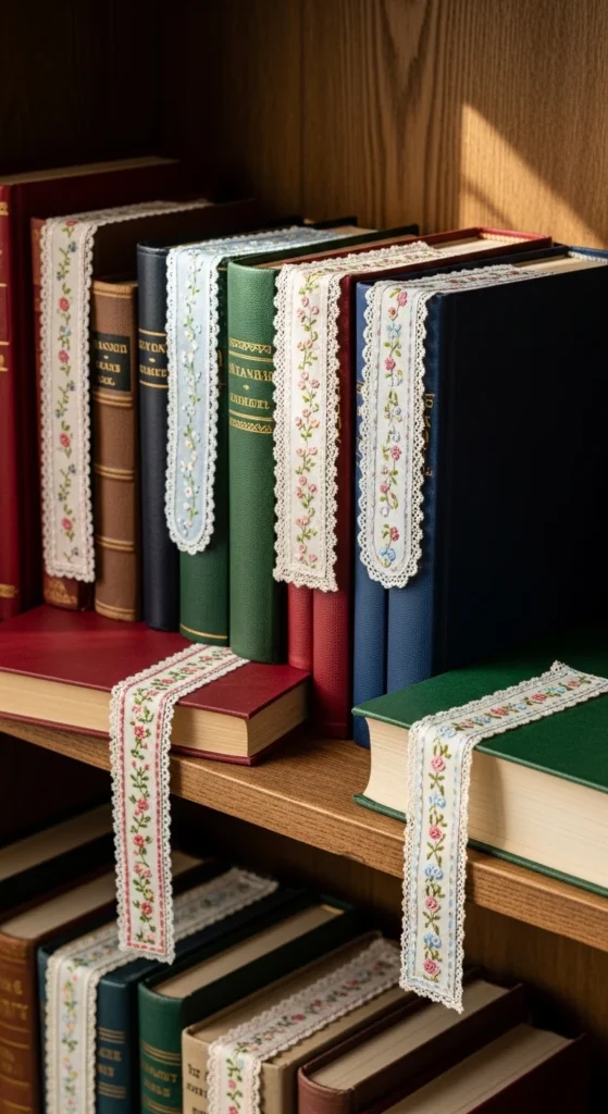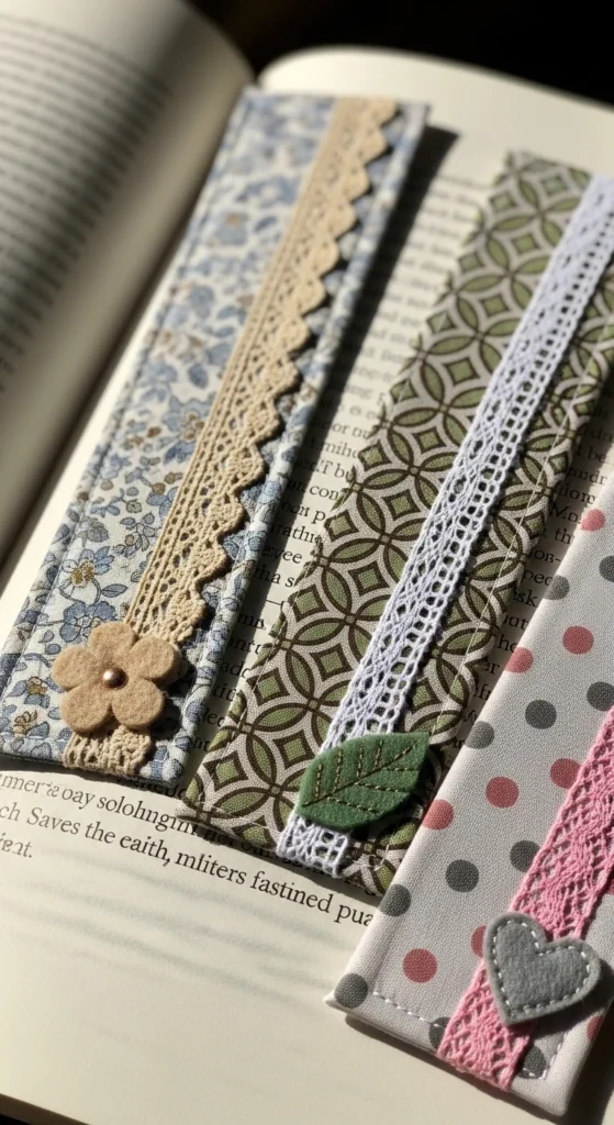 Ribbon and fabric bookmarks are a lovely choice when you want something soft and a little more polished than paper. Cut ribbon, cotton fabric, or felt into narrow lengths, then sew or glue them together for extra strength. You can leave them plain, add lace trim, stitch a few little flowers, or glue on a tiny fabric patch near the top. These bookmarks feel especially nice in journals, novels, and gift books because they drape gently over the page. This is also a great way to use leftover ribbon, fabric strips, or trim from sewing projects. If you want a low-cost version, cut long strips from an old shirt or pillowcase and back them with interfacing, felt, or another layer of cloth. Add a bead or tassel at the top if you want more detail. Since fabric bookmarks do not crease the way paper sometimes can, they are a nice option for readers who use the same bookmark often. They also look charming tied in a bundle as a handmade gift set. It is a simple craft that feels soft, practical, and just a little dressier than basic cardstock designs.