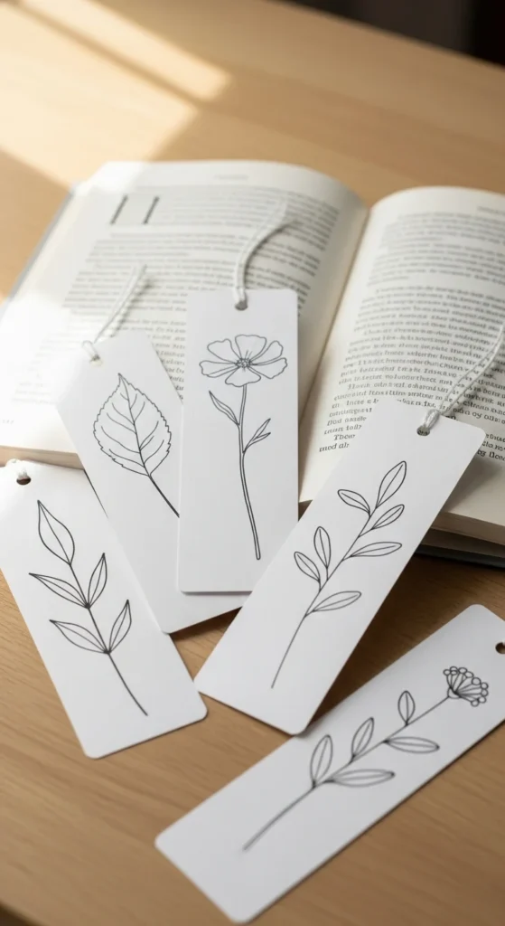 Minimal line art bookmarks are perfect if you like something simple, clean, and easy to make. Start with white or neutral cardstock, then draw delicate lines such as leaves, flower stems, moons, abstract faces, books, or curved shapes using a black pen or dark marker. The beauty of this style is its simplicity. You do not need lots of color or decoration to make it look nice. A few careful lines can be enough. This makes it a very budget-friendly project because the supply list stays small. If you want a little extra detail, add a narrow strip of color, a small stamped dot pattern, or a neat ribbon at the top. These bookmarks are especially nice for older readers, journals, planners, or gift books where you want a softer grown-up look. They can also be laminated easily for strength without losing the clean style. If you enjoy sketching but do not want a big art project, this is a nice middle ground. It turns quick pen drawings into something useful and pretty. A small stack of line art bookmarks can also make a lovely handmade gift for a friend who enjoys quiet, simple design.
