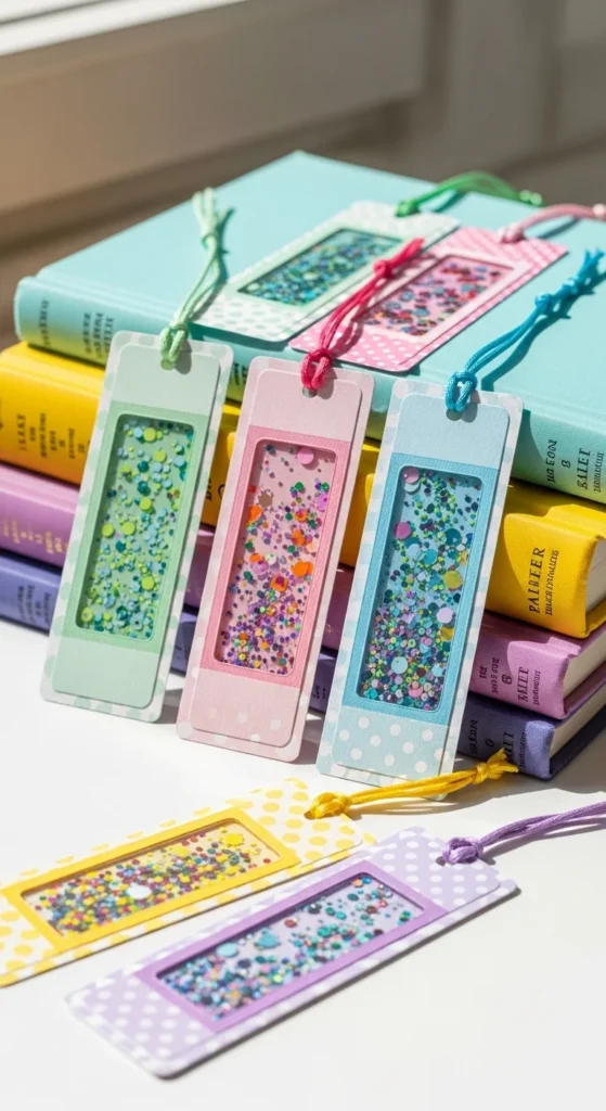 Shaker bookmarks are one of the most playful bookmark ideas because they move and sparkle when you pick them up. To make one, create a frame from cardstock, leave a clear window in the middle, and seal tiny sequins, confetti, glitter shapes, or paper stars inside with transparent plastic. The finished bookmark feels fun and eye-catching, especially for kids and teens. This is a good project when you want something a little different from plain flat bookmarks. It does take a few extra steps, but the effect is still easy enough for a simple home craft session. Use recycled plastic packaging for the clear center if you want to save money. Foam tape helps create space for the shaker filling, but layered cardstock can work too. Keep the inside details small so the bookmark stays flat enough for books. These bookmarks are great for party favors, classroom prizes, or gift bags because they feel exciting right away. Bright colors make them playful, while pastel sequins give a softer look. It is a cute project that turns basic paper crafting into something interactive and extra fun to use while reading.