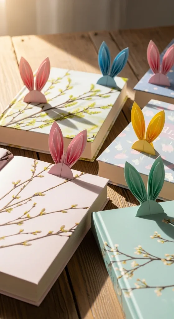 Bunny ear bookmarks are an easy favorite because they look cute right away and only take a little paper and imagination. You can make them as corner bookmarks with long ears sticking up or as full strip bookmarks with a bunny face at the top. Add little whiskers, sleepy eyes, a pink nose, and soft cheeks for extra charm. This idea is especially nice for spring reading, Easter baskets, children’s books, or gift sets for young readers. White, pink, gray, and beige are classic bunny colors, but pastel blue or lavender versions can look adorable too. This is a very affordable craft because it uses small pieces of cardstock or scrapbook paper. If you do not have fancy supplies, plain paper and markers work fine. Kids usually enjoy this one because the shapes are simple and the result feels playful. A bundle of bunny bookmarks tied with ribbon can be a sweet little gift with a storybook or journal. It is a quick craft that feels cheerful, soft, and handmade, which makes it a lovely choice when you want reading fun without a complicated project.