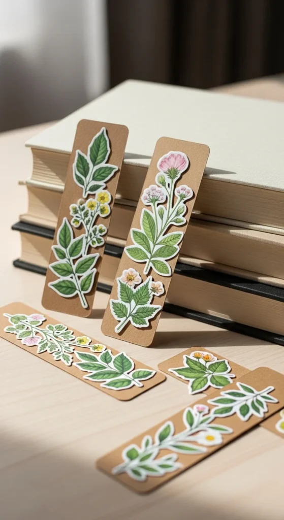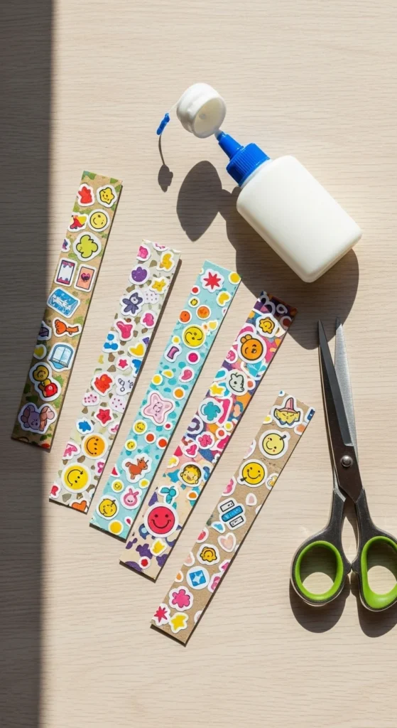 Sticker layer bookmarks are ideal when you want something cute but do not feel like drawing or painting. Start with cardstock or recycled cardboard strips, then decorate them with layered stickers such as flowers, leaves, moons, stars, fruit, bows, animals, or tiny decorative shapes. Mixing a few sizes makes the bookmark look fuller without making it bulky. This is a very easy craft for children, teens, and adults because the main job is arranging and pressing stickers into place. It is also a good way to use leftover sticker sheets that have only a few designs remaining. If you want a neat look, stick to one color theme. If you want something playful, mix many colors and shapes together. Clear tape or laminating sheets can help protect the stickers for everyday use. Add a punched hole and ribbon if you like, though the bookmark also works well as a plain strip. These bookmarks are great for party bags, school rewards, or little handmade extras inside gifts. It is one of the lowest-effort bookmark ideas, but it still feels personal because you can build each design around a different mood, style, or favorite theme.