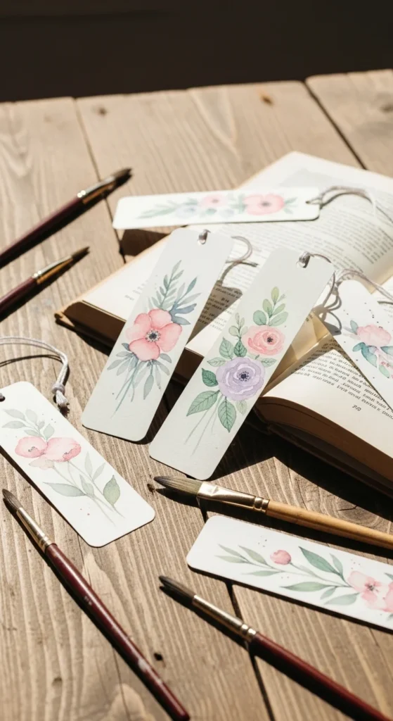 Watercolor strip bookmarks are perfect when you want something soft, pretty, and easy to personalize. Cut thick paper or cardstock into long strips, then paint each one with simple washes of color. You do not need detailed art skills here. Even loose strokes in pink, blue, peach, green, or lavender can look beautiful once dry. Add a ribbon through a hole at the top if you want a polished finish. This is a very budget-friendly craft because one sheet of cardstock can make several bookmarks, and a small paint set goes a long way. If you do not have watercolor paper, use any thick paper you already have at home. Floral touches, tiny dots, clouds, moons, or soft ombré color fades also work well. These bookmarks make sweet gifts for readers, teachers, and friends because every one feels slightly different. If you want to keep them sturdy, cover them with clear tape or self-adhesive plastic after the paint dries. This project feels calm and satisfying, and the result looks much more special than the amount of time it takes. It is simple crafting with a pretty everyday use.
