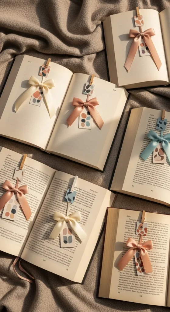 Tiny bow bookmarks are sweet, simple, and perfect when you want something delicate and cute without a long craft session. Start with a bookmark strip, paperclip, or narrow ribbon base, then add a tiny bow made from ribbon, paper, felt, or fabric near the top. That little detail is enough to make the bookmark feel pretty and giftable. You can keep the rest plain or add dots, florals, pastel stripes, or a soft painted background. This project is especially nice for journals, romance books, planners, and gift books because it feels gentle and decorative without taking up much space on the page. Ribbon scraps work beautifully here, which makes it easy to keep the cost low. If you want the bow to stay firm, glue it onto cardstock first before attaching it. A small pearl bead or felt center can add extra charm, though the bow looks lovely on its own too. These bookmarks are easy to make in sets for friends, reading groups, or party favors. It is a light, pretty craft that turns very basic materials into something charming enough to make every reading session feel a little more special.