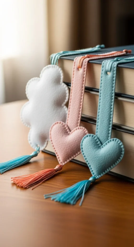 Felt shape bookmarks are soft, colorful, and easy to make even if you do not sew much. Cut felt into simple shapes like hearts, clouds, stars, flowers, or circles, then glue or stitch them onto a long felt strip. You can also make two matching pieces and layer them together for a thicker bookmark. Felt is a great material for this because it does not fray, it is easy to cut, and it comes in lots of cheerful colors. Small scraps from older projects work perfectly, which keeps the cost low. If you want more detail, add tiny stitched eyes, a smile, or a contrasting border around the edges. Ribbon, yarn, or embroidery floss can be tied at the top for a tassel. These bookmarks work well for children’s books, gifts, or reading corners that need something cute and durable. Since felt bends without tearing easily, it is a nice option for younger readers too. You can make several in one sitting and mix colors for a bright set. This is one of those crafts that looks charming right away and feels useful from the moment it is finished.