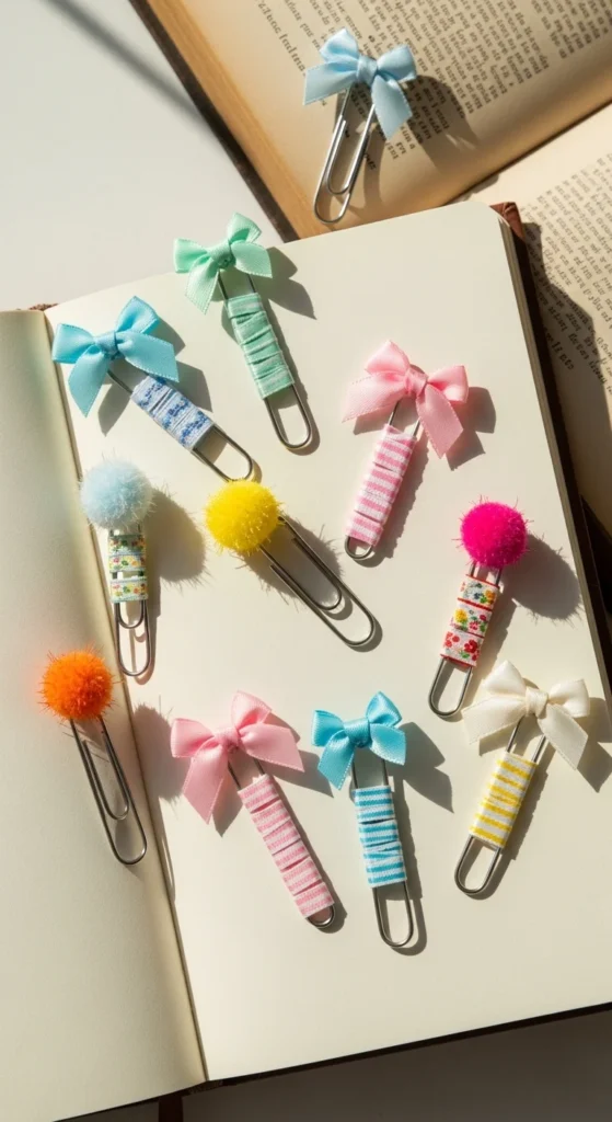 Decorated paperclip bookmarks are perfect when you want a bookmark in just a few minutes. Start with jumbo paperclips and add small details like ribbon bows, pom-poms, felt stars, tassels, beads, or tiny paper flowers. The clip slides onto the top of a page, so it works more like a tab than a full strip bookmark. That makes it especially handy for planners, cookbooks, school books, and journals. This is a very low-cost craft because a box of paperclips can make a lot of finished bookmarks, and the decorations can come from leftover ribbon and scrap materials. If you want a cleaner look, use one ribbon color and trim the ends neatly. If you want something playful, mix textures and colors. These bookmarks are great for party favors, study groups, and little gifts because they are small and easy to batch-make. Kids can help too, especially with tying ribbons or choosing shapes. Keep a few in a small jar on your desk so they are always ready. It is a tiny craft, but the result is cute, practical, and easy to use every day without taking up space inside the book.