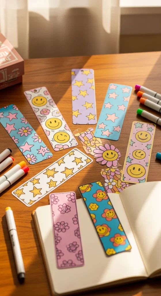 Doodle art bookmarks are a fun option when you want to craft without a lot of planning. Cut long strips of cardstock, then fill them with easy hand-drawn details like stars, flowers, swirls, dots, hearts, smiley faces, clouds, tiny mushrooms, or books. You can use black pens for a simple look or color everything in with markers for something brighter. This is one of the easiest bookmark ideas because there are no strict rules. Even casual little drawings can look charming once the bookmark is finished. It is also very affordable since you only need paper and pens. If you want the bookmark to last longer, laminate it or cover both sides with clear tape. This makes it more durable for school books or everyday reading. A hole punch and ribbon at the top can make it look more finished. Doodle bookmarks are especially good for kids, teens, and classroom crafting because everyone can make their own version without copying one exact design. They also work well as little handmade extras tucked into gift books. It is quick, personal, and a nice way to turn simple drawing into something useful.