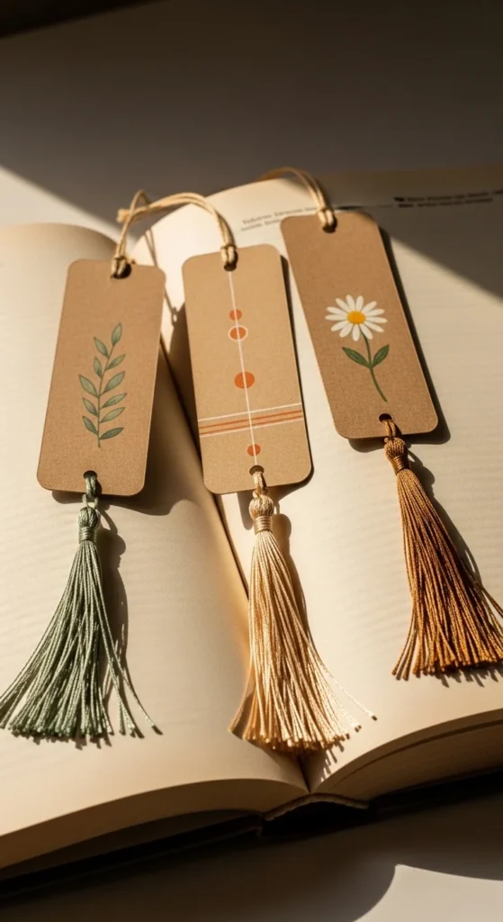 Tassel top bookmarks are simple, classic, and easy to dress up in many styles. Begin with a plain cardstock strip, then punch a hole at the top and attach a tassel made from embroidery floss, yarn, ribbon, or twine. That one small detail makes the bookmark feel more complete and gift-ready. You can leave the strip plain, paint it, add stickers, stamp it, or decorate it with tiny paper cutouts. Kraft cardstock gives a warm neutral look, while colored cardstock feels more playful. This craft is ideal if you want something easy that still looks polished. It is also budget-friendly because you can use leftover thread or yarn for the tassels. If you do not want to make tassels from scratch, tie on a short ribbon bundle and trim the ends evenly. These bookmarks are nice for journals, novels, cookbooks, and school reading. A set of three in matching colors can make a cute gift for a book-loving friend. Since the design stays flat except for the tassel, they slide into books easily. It is a quick project with a clean, pretty result that feels useful every day.
