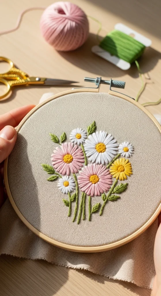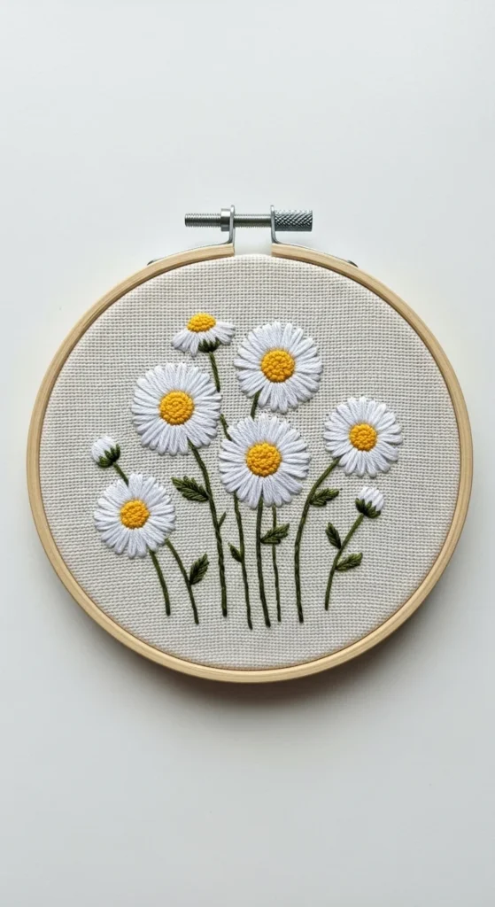 A simple daisy hoop is one of the best first embroidery projects because it teaches a lot without feeling hard. The petals can be made with lazy daisy stitches, the centers can be little knots or short filled stitches, and the stems can be straight or backstitch. That means you get to practice a few basics in one neat project. Use cream or pale beige fabric for a soft look, then pick white, butter yellow, and sage green thread. A small hoop is enough, which keeps the cost low and makes the project feel easier to finish. If you want to save even more, use fabric scraps from an old cotton pillowcase or a thrifted shirt. This project looks pretty on the wall, but it also works as a gift because flowers always feel friendly and handmade. Keep the design loose rather than trying to make every petal perfect. Small differences actually make it look more natural. A daisy hoop is cheerful, quick to stitch, and a lovely way to start learning embroidery without getting overwhelmed by a large or detailed pattern.
