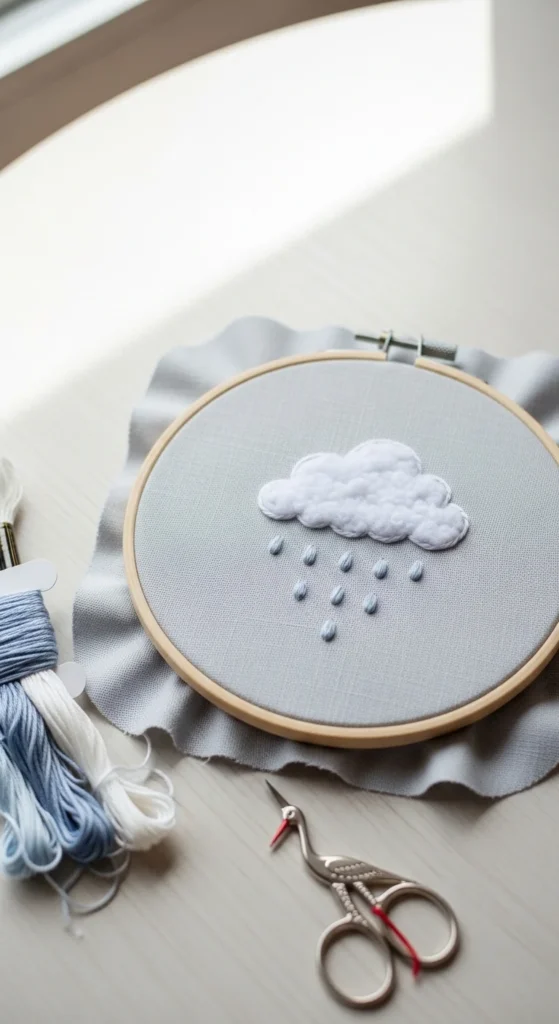 A cloud and raindrop hoop is simple, relaxing, and perfect for anyone who likes soft minimal decor. The cloud shape can be outlined with backstitch or lightly filled with satin stitch, while the raindrops can be little straight stitches or tiny teardrop shapes underneath. This kind of design works especially well in nurseries, bedrooms, or calm reading corners because the whole mood feels gentle and light. It is a good beginner project because the shapes are basic and forgiving. You do not need detailed petals, lettering, or fancy stitch combinations. White, pale blue, gray, and soft lavender all suit the theme nicely. If you want to make it feel a bit warmer, use cream fabric and muted thread colors. This is also a good project for trying different stitch lengths and seeing how texture changes the final look. A small hoop is enough, so it stays budget friendly. Sometimes the best beginner projects are the ones that keep everything simple. A soft cloud with a few raindrops can feel surprisingly pretty when you let the clean lines and gentle color palette carry the design.