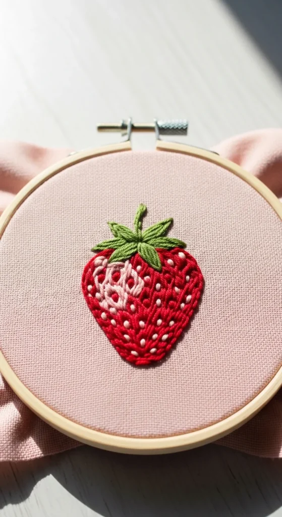 A tiny strawberry motif is one of those beginner projects that feels adorable without taking much time. The berry shape is simple, the leaves are easy, and the little seed dots give you a chance to practice tiny details without overwhelming the whole project. You can make one strawberry in the center of a hoop, stitch a few in a small cluster, or use the design on a bookmark, tote, or napkin corner. This flexibility makes it a very practical pattern to learn. Red and green thread are classic, but soft coral and sage can also look beautiful if you want a more muted style. A strawberry works especially well on pale pink, cream, or natural linen fabric. Because the motif is small, it is very budget friendly and a great use for thread leftovers. It also gives that satisfying feeling of finishing something cute in one short crafting session. Beginner-friendly embroidery does not have to be plain. A small fruit design like this feels fun, handmade, and cheerful while still staying simple enough for someone just learning the basics.