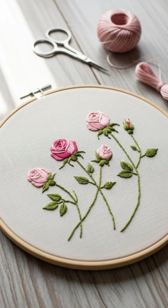 A rosebud stem practice piece is a nice way to try floral embroidery without jumping into large layered roses. Instead of making full blooms, stitch a few little buds on thin stems with small leaves. This keeps the design light and much easier to manage. Rosebuds also look beautiful when they are slightly imperfect, which makes them ideal for beginners. Use blush, dusty rose, cream, or soft berry tones for the buds, then pair them with sage or olive green stems. You can arrange the buds in a loose spray across one side of the hoop, or make a vertical stem cluster for a bookmark or pouch front. This project helps you practice neat curves, small satin stitches, and balanced spacing without needing a complicated floral composition. It also feels very relaxing because the repeated little buds are easy to build one by one. If you want to save money, use just two or three thread colors and simple cotton fabric. The finished piece feels delicate and pretty, but the actual process stays very approachable. It is a strong choice for beginners who want something floral without feeling overwhelmed.