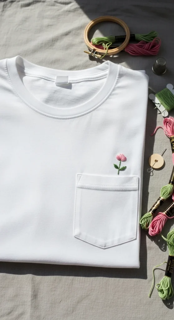 A pocket tee flower stitch is a fun first wearable embroidery project because it adds personality to clothing without requiring a large design. You only need a tiny flower, leaf sprig, or little daisy shape stitched just above the pocket edge or near the corner. That small placement keeps the project simple while still making the shirt feel customized. This is a good beginner step if you want to move beyond hoops and put embroidery onto something useful. Choose a cotton shirt so the fabric is easier to stitch through, and use a small hoop if needed to keep the area steady. A simple backstitch stem and a few lazy daisy petals are often enough. Keep the colors soft if you want a subtle look, or pick brighter thread if you want the flower to stand out more. This project is affordable if you already own a basic tee, and it makes clothing feel more personal without much effort. Tiny stitched details can make everyday pieces feel special in a very calm handmade way.