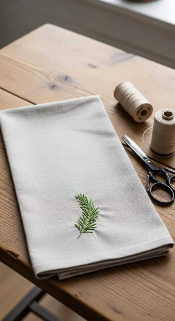 A tea towel herb sprig is an excellent beginner project because it turns a plain kitchen cloth into something charming and useful. A simple rosemary stem, lavender sprig, thyme branch, or mint leaves can all be stitched with basic lines and leaf shapes. You do not need a large design. One small herb motif near the corner or lower edge already looks lovely. This is a smart project if you enjoy practical crafting, because the finished towel can be used in the kitchen, gifted, or tucked into a basket with homemade items. It is also budget friendly. Plain cotton tea towels are easy to find, and herb designs use only a little green thread plus maybe one accent color. The project helps you practice clean stems and repeated leaf shapes, which are very useful for future floral work. Keep the motif light and simple so the towel still feels neat and functional. A stitched herb sprig brings a warm handmade touch to everyday kitchen items, and that makes it a very satisfying beginner embroidery choice.