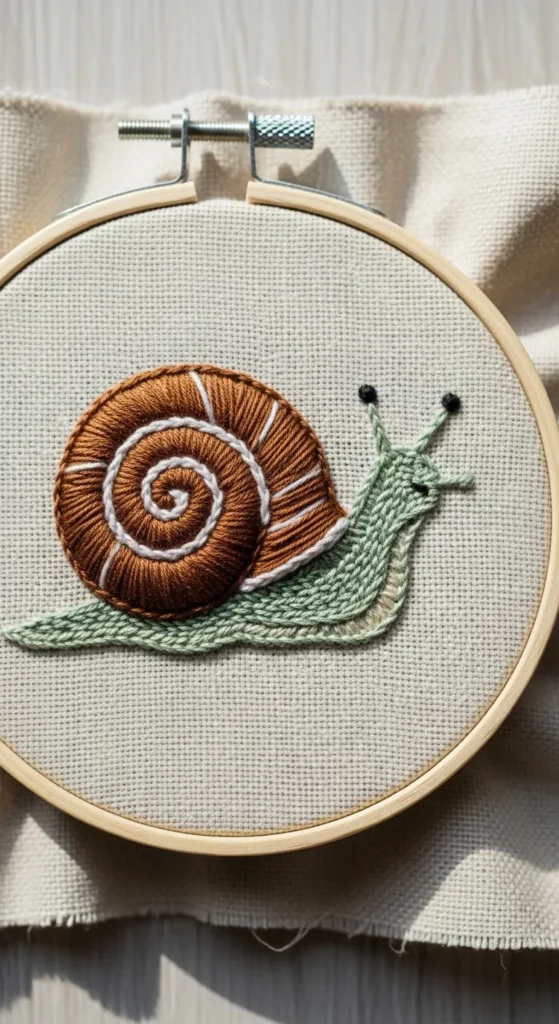 A snail mini hoop is a playful beginner project that feels lighthearted and relaxing to stitch. The shape is simple. One spiral shell, a rounded body, and a pair of tiny feelers are enough to make it recognizable and charming. Because the design is compact, it fits beautifully in a very small hoop, which keeps both the cost and the stitching time low. A snail is also forgiving. If the spiral is slightly uneven or the body line is a little wobbly, it still looks cute. This makes it ideal for someone just learning to control thread and stitch placement. Use earthy tones like brown, cream, sage, and dusty rust for a soft woodland feel. You can leave the background plain or add a tiny mushroom, leaf, or flower for extra detail. This hoop is especially nice for children’s rooms, craft corners, or whimsical gallery walls. It is a fun reminder that beginner embroidery does not have to be serious. Small playful designs often make the hobby feel more enjoyable and less intimidating right from the start.