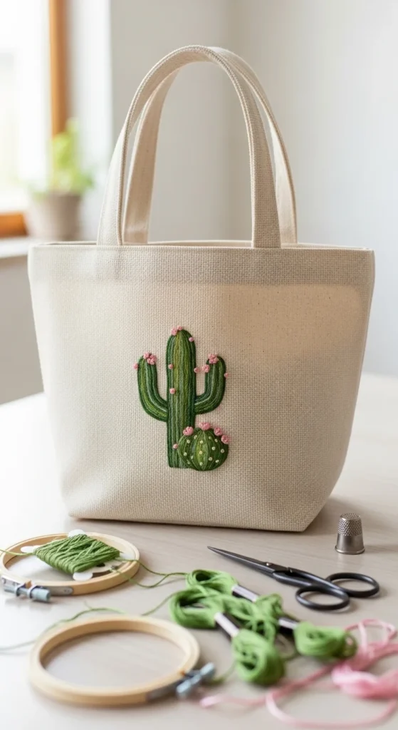 A tote bag cactus design is a beginner-friendly project that gives you something useful at the end, which always feels rewarding. A cactus is easy to simplify into one or two upright shapes with small arms and a tiny flower on top if you want a cute detail. Backstitch or split stitch works well for the outline, and simple filling stitches can give the cactus body a little texture. Because canvas totes are common and affordable, this project can stay very budget friendly. It is also a nice way to practice stitching on thicker fabric without committing to a huge design. Place the cactus near the lower corner, above the pocket area if the tote has one, or centered in a small section for a neat finished look. Green, dusty olive, and muted pink work beautifully together. If you want to keep it even easier, stitch only the outline and skip the filling. This project feels practical, cheerful, and beginner-safe. It turns a plain everyday bag into something personal, and that makes it a very satisfying embroidery project to complete.