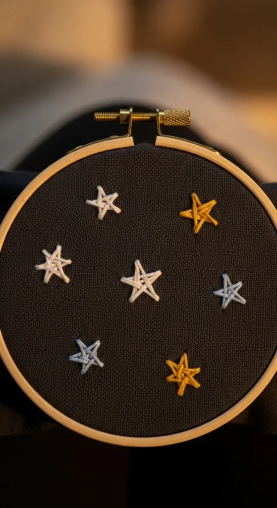 A simple star sampler is a calming project because it is mostly repetition, and repetition is often what makes embroidery feel relaxing. Stitch a group of small stars using straight stitches, tiny crosses, or little spark shapes across dark or neutral fabric. The design can be scattered randomly or arranged in a soft cluster. This is a great beginner project because it teaches spacing, stitch consistency, and control without needing any difficult shapes. It is also very flexible. You can keep it in a hoop for wall decor, stitch it onto a pouch, or add a tiny cluster to the edge of a pillow or cloth bookmark. Mustard, cream, pale blue, and soft gold all work nicely for a celestial look. Because each star uses just a few stitches, the project is low cost and a good way to use leftover floss. It also finishes quickly, which can feel very encouraging for beginners. A star sampler has a calm quiet beauty, and sometimes that is exactly what makes a small embroidery project feel so enjoyable to work on.