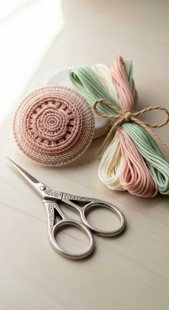 A woven wheel rose brooch is a lovely beginner project for anyone ready to try one decorative flower technique without making a whole large hoop. The woven wheel rose looks more detailed than it really is, which makes it very rewarding. You create a small stitched base, then weave the thread around it until a rose shape forms. Once you make one, it starts to feel quite relaxing. Turn the finished flower into a little brooch, patch, or mini framed piece. That keeps the project focused and manageable. This is a good use for felt or sturdy cotton scraps, which helps keep costs down. Soft pink, dusty rose, cream, and berry tones all work beautifully. Add one or two tiny green leaves and the design already feels complete. Because the rose is the main event, you do not need much else around it. A small project like this is perfect for beginners who want to try a new stitch style while still keeping the overall piece short and achievable. It feels pretty, handmade, and a little extra special without becoming too complicated.