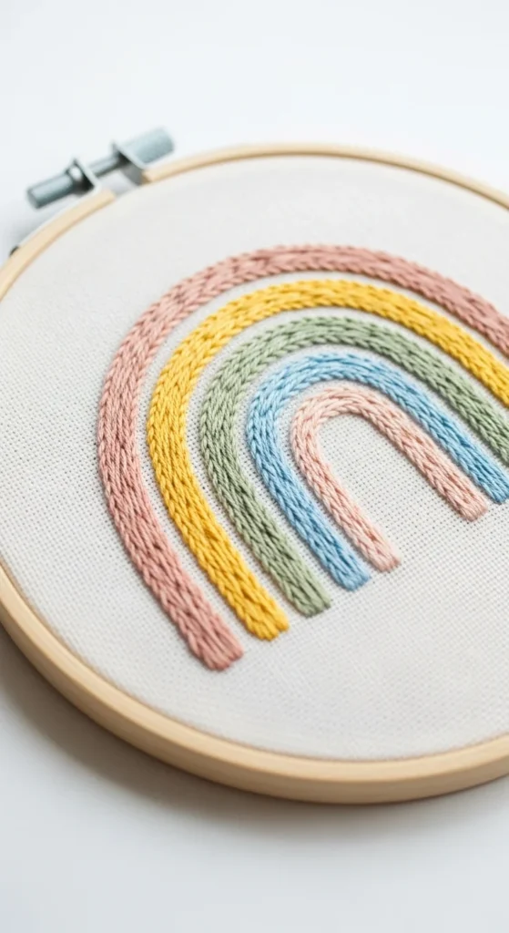 A rainbow arch practice hoop is ideal for beginners because the design relies on repeated curved lines rather than tiny detailed shapes. Each arch can be stitched in a different color, which makes the project feel cheerful and lets you use small amounts of leftover floss. Soft tones like blush, peach, pale yellow, sage, and dusty blue give the hoop a calm handmade look that works well in nurseries, bedrooms, or craft rooms. This design is also helpful for building rhythm. You repeat the same motion over and over, which makes the process feel almost meditative. Use backstitch, split stitch, or chain stitch depending on what you want to practice. The hoop can stay minimal with just the arches, or you can add tiny clouds, stars, or dots around them for a little extra charm. A small or medium hoop is perfect, so the project stays affordable and does not drag on too long. It is a great reminder that beginner embroidery can be both relaxing and visually appealing without requiring a complex pattern.