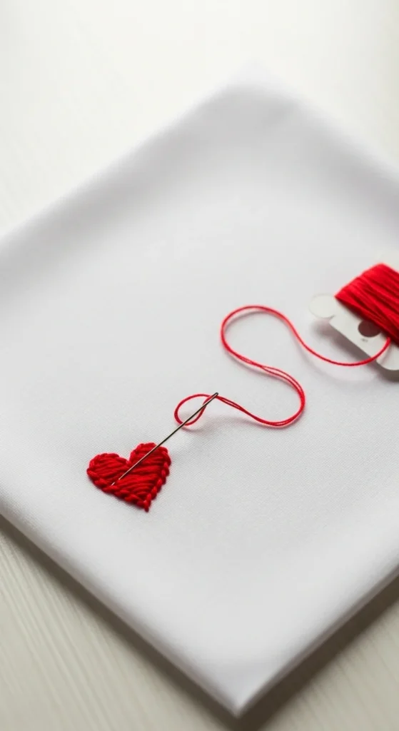 A tiny heart stitched into the corner of fabric is a very easy project, but it still feels cute and useful when finished. You can add it to a handkerchief, cloth napkin, tote bag, pocket tee, or even a pillow cover. The shape is small, so it does not take long, and you only need one or two thread colors. A heart can be outlined with backstitch or filled with satin stitch if you want a smoother look. Beginners often like this kind of project because it is low pressure. If one side of the heart is a little uneven, it still looks sweet. It is also a smart way to practice keeping your stitches consistent without having to work on a whole large piece. Red, blush pink, soft coral, or even mustard can look lovely. If you want to make it more personal, stitch a few tiny hearts in a row or place one near the hem of a gift item. This project is budget friendly, quick to finish, and a nice reminder that even the smallest embroidery can make ordinary fabric feel more thoughtful and special.