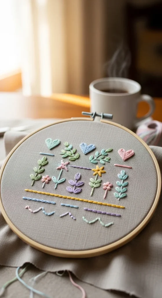 A mixed beginner stitch hoop is a perfect final project because it lets you practice several easy ideas in one place without worrying about making a polished single picture. Divide the hoop loosely into little sections or scatter small motifs across the fabric. Add a heart, a leaf, a star, a tiny flower, a curved line, and maybe a short word if you want. Use each section to try one simple stitch, such as backstitch, lazy daisy, satin stitch, French knots, or straight stitch. This kind of sampler is great because it removes pressure. You are not trying to create one perfect finished design. You are simply learning while making something colorful and charming. It also helps you see which stitches you enjoy most before starting larger embroidery projects. Use leftover floss in soft colors and any plain cotton or linen fabric you have on hand. Once the hoop is done, it can still hang on the wall as a sweet handmade piece. For beginners, this is one of the most useful projects of all because it builds confidence while keeping the whole experience relaxed and creative.
