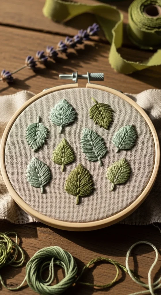 A leaf sampler is perfect for beginners because leaves are forgiving and there are so many easy ways to stitch them. You can make long simple leaves with satin stitch, tiny angled leaves with fishbone-style lines, or soft leafy stems with just straight stitches on each side. Put several leaf styles in one hoop and you instantly have a project that is both pretty and useful for practice. Green thread shades work best here, but you do not need a big collection. Two or three tones are enough. This makes the project affordable while still giving it some depth. Use linen or cotton fabric in a neutral tone so the leaves stand out softly. A leaf sampler looks lovely on the wall in a kitchen, bedroom, or craft corner, and it also helps you build confidence for future floral designs. If you are nervous about spacing, sketch a few simple stems in pencil first. This project is calm, repetitive, and relaxing in the best way. It lets you practice without needing a perfect final picture, which is exactly what many beginners want.