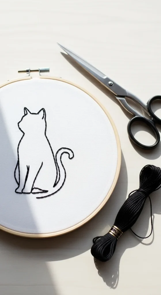 A backstitch cat outline is a fun starter project because it proves you can make something charming with just one stitch. The whole design can be done using black or dark brown thread on white or cream fabric. A sitting cat, curled cat, or simple cat face all work well. Because the design is only an outline, it stays light and clean rather than crowded. That makes it easier to manage if you are still learning how to keep your stitches even. This project also works beyond a hoop. You can stitch the same little cat onto a tote, shirt pocket, zipper pouch, or cloth bookmark. That makes it a good value project because one design idea can be reused in different ways. If you are tracing the pattern, keep the lines smooth and simple. Avoid tiny fussy details. The real charm comes from the clean silhouette. This project is especially nice for pet lovers or anyone who likes minimal handmade decor. It is affordable, quick to finish, and a great way to practice backstitch while making something that still feels stylish and giftable.