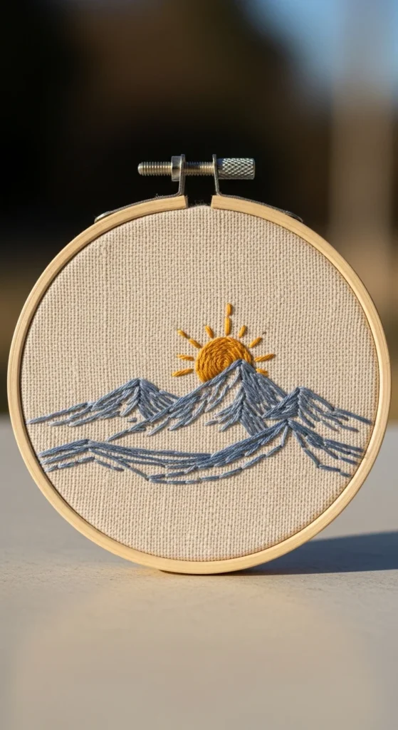 A mountain and sun mini hoop is a great project for beginners who want something modern and simple rather than floral. The shapes are easy. A few angled lines make the mountains, a half circle makes the sun, and a couple of straight stitches can suggest ground or sky. Because the design is minimal, it looks clean even if your stitches are not perfect yet. This is a good project for practicing straight stitch and backstitch without too much pressure. It also works well on tote bags or pockets if you want something functional instead of wall art. Use muted blue, gray, sand, mustard, or rust thread for a soft outdoor look. A small hoop keeps the project quick and inexpensive. You can also make a set with different landscapes, like hills, moon, or desert arches, using the same basic idea. This project feels peaceful and current, and it is nice for people who love nature-inspired decor but want something less detailed. A tiny landscape can do a lot with just a few lines and colors.