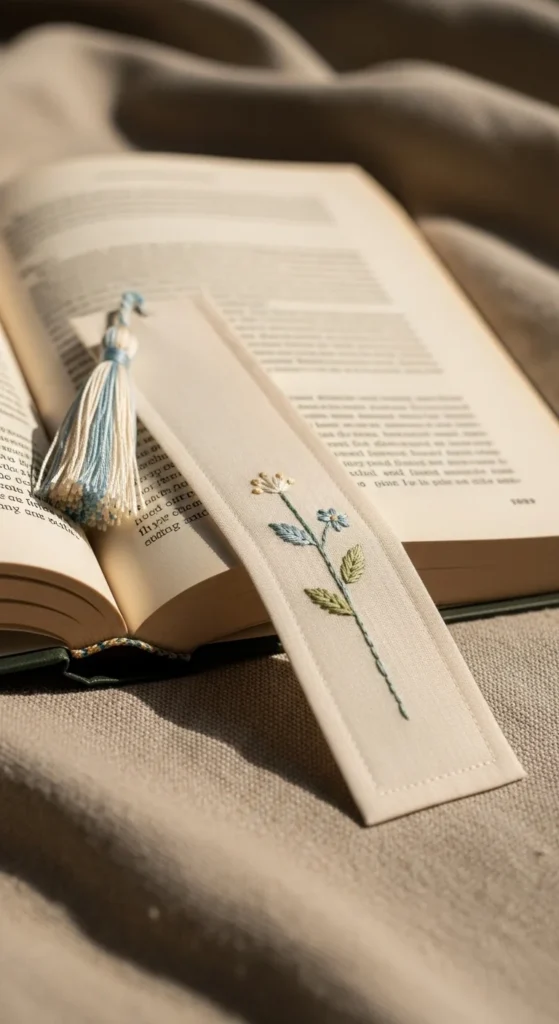 An embroidered bookmark strip is one of the most useful beginner projects because you end up with something pretty that you can actually use every day. Start with a strip of cotton or linen, then stitch a tiny flower, a leaf sprig, a star, or even a small heart near one end. Keep the design narrow so it fits neatly inside a book. You can leave the fabric plain, back it with another strip for extra strength, or even add a tassel if you want a more finished look. This project is low cost because it uses small scraps of fabric and very little thread. It is also nice for practicing clean stitching on a small scale. If you make a mistake, it is easy to start again without losing much material. Bookmarks also make lovely gifts, especially if you pair one with a book or journal. The project feels calm, practical, and easy to finish in one sitting. For beginners, that quick win matters. It helps you enjoy embroidery as a relaxing habit rather than feeling like every project has to become a large wall piece.