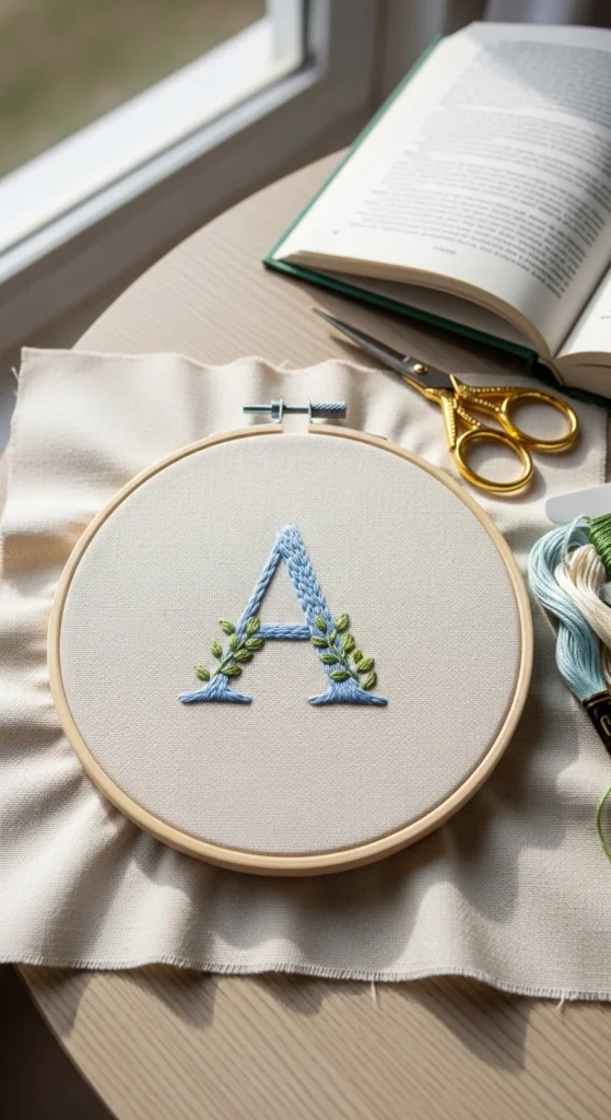 A personalized initial hoop is a smart beginner project because one letter gives the design structure without making it too complicated. Choose a block letter or a simple script style, then stitch it in the center of a small hoop. You can leave it plain for a clean look or add tiny leaf sprigs, dots, or flowers around the edges. This project feels special because it can be made for yourself, a child’s room, or a handmade gift. It also helps you practice following curved and straight lines, which is useful for almost every future embroidery pattern. If you are worried about lettering, lightly trace the letter first using pencil or a water-erasable pen. Stick with one main thread color and maybe one accent color to keep the project affordable. Initial hoops look lovely in bedrooms, nurseries, or gallery walls with other handmade decor. Because the design stays small and focused, it is easy to finish without losing momentum. It is a nice example of how beginner embroidery can still feel polished and personal with only a few materials.