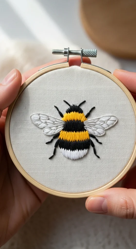 A simple bumblebee patch is cute, cheerful, and easy to stitch with just a few colors. You only need yellow, black, white, and maybe a soft blue or green if you want a tiny floral accent nearby. The bee body can be built from small rounded sections, while the wings stay very light and simple. This project is a good beginner challenge because it mixes outline and filled areas without becoming too detailed. You can stitch the design in a hoop, but it also works beautifully as a patch for a tote bag, denim pocket, or zip pouch. That makes it a fun practical project instead of something that only hangs on the wall. If you want to save money, use fabric scraps and leftover thread from other projects. The bee is small enough that a little floss goes a long way. This project feels friendly and playful, and it teaches control in a very approachable way. Tiny motifs like this are often the best kind of beginner embroidery because they finish quickly and still leave you with something charming at the end.