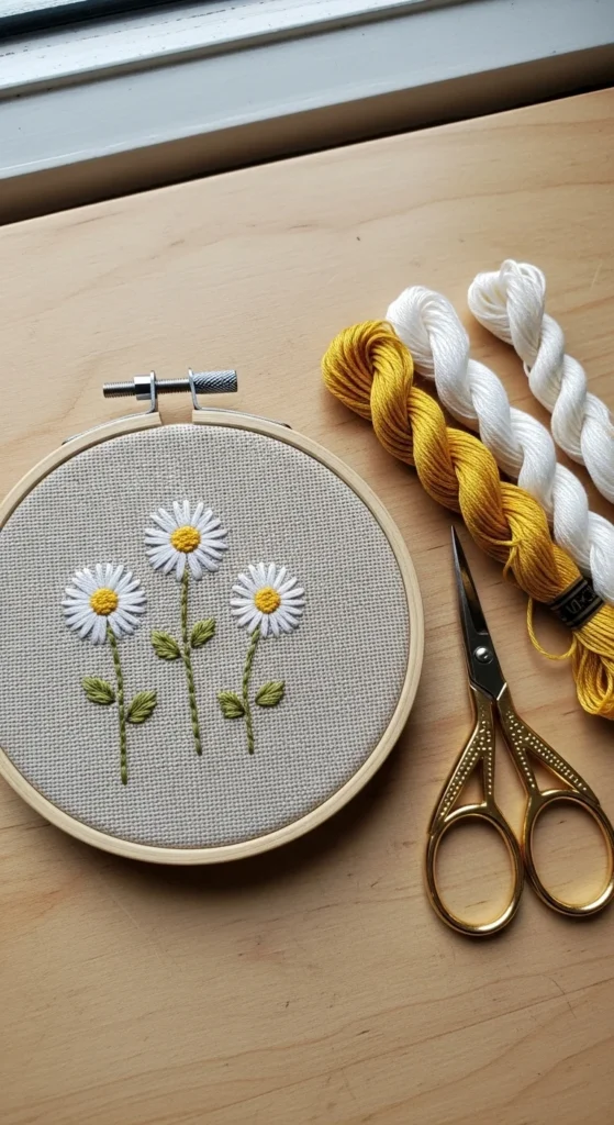 A simple daisy flower is one of the best first embroidery designs because it teaches shape, spacing, and control without feeling hard. Each petal can be made with lazy daisy stitch, and the center can be a small group of knots or satin stitches. That means you can make a full floral design with only a few repeated moves. Use white petals, a yellow center, and green stems for a classic look, or switch to pink and peach if you want something softer. This design is budget-friendly because you only need three thread colors and a scrap of plain fabric. It also works on small hoops, tote bags, handkerchiefs, or even a shirt pocket. If you are nervous, start with one single flower before making a group. A daisy still looks cute even if the petals are slightly uneven, so it is forgiving for beginners. You can place one flower in the center of a hoop or stitch a row of small daisies across a bookmark. This kind of design helps your hands get used to stitching rhythm, and the result feels cheerful, simple, and easy to finish in one relaxed sitting.