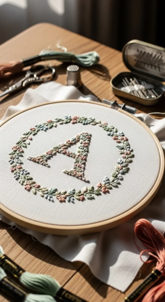 A monogram letter hoop is a great starter project because it feels personal and giftable while still being simple enough for beginners. Choose one large letter, trace it lightly onto the fabric, and stitch it with backstitch, stem stitch, or split stitch. If you want extra decoration, add a few tiny leaves, dots, or flowers around the letter, but keep the design open so it does not feel crowded. This project stays affordable because it uses limited thread and can be made on a small hoop with scrap fabric. A monogram hoop makes a sweet gift for birthdays, baby rooms, desks, or gallery walls, and it is also a nice way to practice stitching around curves and corners. If you are just starting, use a block-style letter instead of a cursive one. Straight edges are easier to manage. You can stitch the letter in one color or use a second shade for the small accents. This design is useful because it helps you work with a traced guide and gives you a finished piece that feels custom. Even simple initials can look thoughtful and polished when stitched neatly on clean fabric with a little space around them.