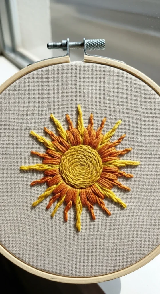A sunny little sun is a cheerful embroidery design that is easy to stitch and great for beginners who want something quick. The center can be a simple circle outlined with backstitch or filled with satin stitch, and the rays can be made with short straight stitches coming out from the edge. That means the project uses only a few basic moves, which helps you learn without feeling stuck. This is also a budget-friendly idea because yellow and orange thread are often enough to complete the whole design. A sun motif works well in a hoop, on a pocket, or in the corner of a tote bag where a small pop of color feels fun and bright. If you want a softer style, use mustard and cream instead of strong yellow. If you want it more playful, add a tiny cloud or two nearby. The shape is forgiving, so slight differences in the rays will not harm the design. This kind of motif is good for building confidence because it finishes fast and looks happy right away. A small embroidered sun can make your fabric feel handmade and warm without asking for complicated stitching or a big time commitment.