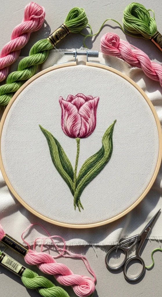 A single tulip bloom is a lovely embroidery design for beginners because it uses only a few shapes but still looks elegant and complete. The flower head can be stitched with satin stitch or outlined and lightly filled, while the stem and leaf can be done in backstitch and simple long stitches. Tulips are easier than many other flowers because the petals are broad and clear, so you do not need to manage lots of tiny details. This is a good low-cost project since three thread colors are usually enough. Pink, red, yellow, or purple all work well, and green for the leaves ties everything together. A tulip bloom fits nicely in a small hoop or on the corner of a tea towel or tote bag. If you are nervous about filling the petals, keep the flower as an outline-only design. It will still look graceful. If you want a little extra interest, stitch two small tulips side by side. This kind of project is helpful because it teaches basic floral structure without becoming too busy. It gives you a finished design that feels classic, giftable, and simple enough to complete during a quiet evening at home.