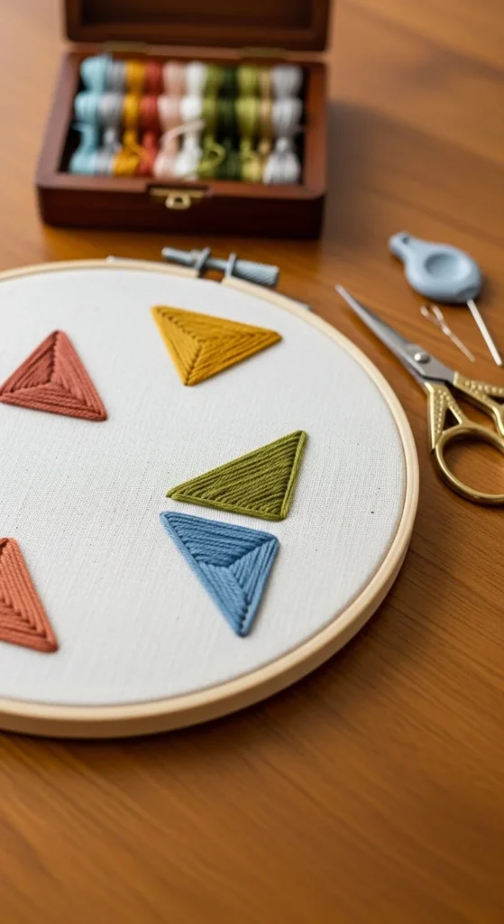 A geometric triangle row is one of the easiest embroidery patterns for beginners because the design relies on straight lines and repetition instead of detailed shapes. Draw a row of small connected or spaced triangles across the fabric, then stitch the outlines with backstitch. You can keep all the triangles the same size for a neat look or vary them slightly for a more relaxed handmade feel. This is a very budget-friendly project because it uses little thread and works perfectly on fabric scraps. It also makes a great practice design for building stitch control and spacing. You can use one color for a modern minimal look or alternate two or three earthy shades like rust, mustard, and dark green. A triangle row works well on bookmarks, pouches, napkins, and even shirt pockets if you want a subtle stitched detail. If you want more interest, fill every second triangle with satin stitch or add tiny dots between the shapes. This project is useful for new stitchers because it teaches steady lines and repeated motion, which helps your hands get more comfortable with the needle. The final result feels simple, neat, and easy to match with many handmade items.