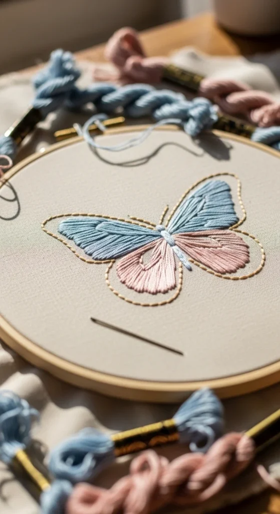 A butterfly outline is a sweet beginner design because it combines soft curves with a shape that still feels familiar and easy to draw. Start by tracing a very simple butterfly with rounded wings and a small body, then stitch the outline with backstitch. You can leave it as an outline-only piece or add a little satin stitch inside the wings if you want light color. This design stays affordable because it looks good even with just one or two thread colors. Black or dark brown thread gives a minimal look, while pink, blue, lavender, or yellow can make it feel softer and more decorative. A butterfly works well in a hoop, on a child’s item, or on a light canvas pouch where a small handmade detail adds charm. If you are brand new, keep the wing shapes broad and avoid tiny inner sections. Bigger spaces are easier to stitch neatly. This project is helpful because it teaches turning around curves and keeping both sides of a shape balanced. Even if the wings are not exactly the same, the final butterfly still looks lovely. That makes it a gentle way to practice shape control without pressure.