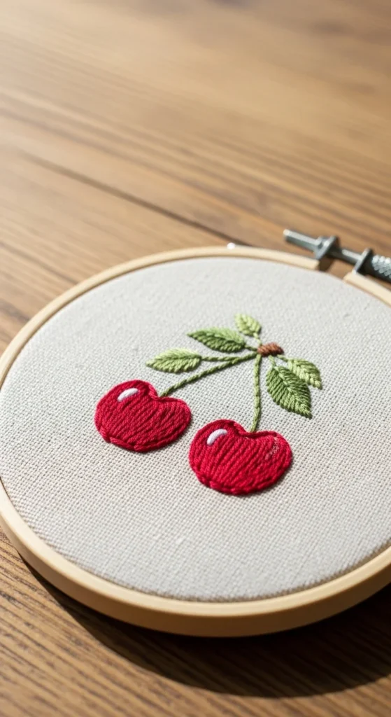 A cute cherry pair is a fast and playful project that works really well for beginners. The cherries can be made as two small red circles, either outlined or lightly filled, with simple green stems joining at the top. Because the shapes are so basic, the design feels easy to map out and stitch, even if you have very little experience. It is also a low-cost idea because red and green thread are enough for the main look, and a tiny piece of fabric is all you need. Cherries look adorable on bookmarks, tote bags, pocket corners, and mini hoops. They also fit nicely into retro or cottage-style handmade gifts. If you do not want to fill the circles fully, use small running stitches in a spiral or back-and-forth pattern so the fruit still looks solid without taking too long. If you want extra charm, add a tiny leaf at the top. This project is useful because it teaches how to stitch simple round shapes and connect them with clean lines. It feels cheerful, quick, and very forgiving, which makes it a great option when you want a design that looks cute without needing much time or technical skill.