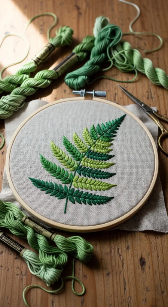 A fern frond pattern is a beautiful beginner-friendly design because it relies on one central line and many small side stitches that repeat in a calm rhythm. Start with the main stem in backstitch, then add short angled stitches along both sides to create that classic fern look. This makes the project feel organized and easy to follow, which is helpful if you are new to embroidery. It is also a budget-friendly pattern because you can complete it with just one green thread color, though two shades can add extra depth if you want. A fern looks elegant in a hoop and also works nicely on tea towels, tote bags, or journal covers. If you are just starting, keep the frond medium-sized and do not add extra leaves. One clean shape is enough. If you want more interest, stitch two fern stems crossing slightly at the base. This design helps beginners practice even spacing and repeated line work without the pressure of filling large areas. The result feels soft, natural, and polished. It is the kind of project that looks more detailed than it really is, which makes it very satisfying for someone who wants a pretty finish without a hard process.