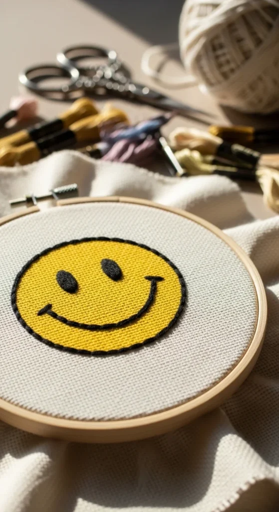 A smiley face stitch project is a fun way to start embroidery because the design is instantly recognizable and only uses a few shapes. You can outline the round face, add two small eyes, and stitch a curved smile with backstitch or split stitch. If you want a fuller look, lightly fill the circle with yellow satin stitch or spaced long stitches. This is one of the easiest beginner ideas because there are no complicated details, and the result feels playful right away. It is also very affordable since the design is small and can be made with one or two colors. A stitched smiley face works well on tote bags, pouches, denim, and simple fabric patches. If you want to keep it extra fast, stitch only the face outline and features. If you want a little more style, add tiny sparkles or dots around it. This project is helpful because it lets you practice curved lines and small facial details without dealing with complex outlines. It also gives a handmade result that feels cheerful and light. Sometimes the best early projects are the ones that make you smile while also helping your hands get used to the process.