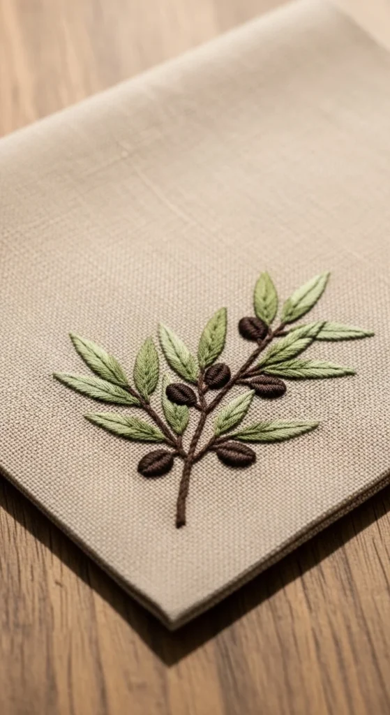 An olive branch corner design is a smart beginner project because it uses a very simple structure but looks polished on household items. The branch can be stitched into one corner of a napkin, tea towel, or placemat using a thin stem and small angled leaves. That corner placement makes the design feel neat and keeps the stitching area small, which is less overwhelming for new stitchers. This is also a low-cost project because you can work on inexpensive cotton napkins or fabric squares and use only two or three thread colors. Green and brown are the natural choices, but sage and gray can look lovely too. If you want a very minimal look, stitch only the stem and leaves. If you want more detail, add a few tiny olive shapes or dots. This kind of design is practical because it turns everyday linens into handmade pieces without asking for a large time investment. It also makes a thoughtful gift when stitched on a simple kitchen cloth. The repeated leaf shape helps you practice consistency, and the small project size makes it easy to finish. That mix of usefulness and simplicity makes this design very beginner-friendly.