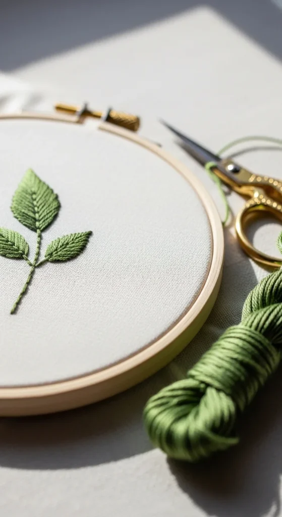 A single leaf branch is a calm and easy project that looks clean and stylish with very little stitching. It usually uses one curved stem and a row of small leaves, which makes it perfect for practicing backstitch and lazy daisy stitch or simple satin stitch. Because the shape is so basic, you do not need to worry about tiny details. Even a loose branch can still look beautiful once it is stitched. This is a smart low-cost design because one or two shades of green are enough to make it work. You can stitch it on a hoop for wall decor, on a napkin corner, or on the edge of a tote bag for a handmade detail that feels soft and modern. If you want to make it even easier, draw one curved line on the fabric and place five to seven leaves along it. That is enough to create a finished look. If you want more interest, add tiny dots or little buds between the leaves. A leaf branch is also a good project for people who like minimal decor and do not want a very busy pattern. It feels peaceful, quick, and very beginner-friendly.