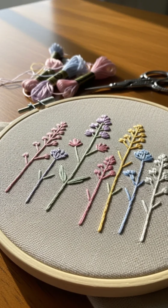 A wildflower stem trio is a lovely way to practice beginner embroidery while creating something that looks soft and detailed. The design is made from three simple stems, each with different small flowers or buds at the top. You can use backstitch for the stems, lazy daisy for petals, and tiny straight stitches for buds or grass-like accents. That means one small hoop can help you practice several basic stitches without turning into a difficult project. This design is budget-friendly because it works beautifully with leftover thread in soft colors like pink, lavender, yellow, green, and blue. It is also flexible. You can make the flowers bright and cheerful or muted and calm depending on your taste. A wildflower trio looks nice in a hoop, on a pocket, or on the front of a notebook cover. If you are just starting, keep each flower very simple and avoid thick filling. The design still looks beautiful because the stems create movement and balance. This project is helpful because it teaches variety while staying manageable. By the time you finish, you will have practiced lines, petals, and tiny accents, all inside one pretty beginner-friendly embroidery piece.